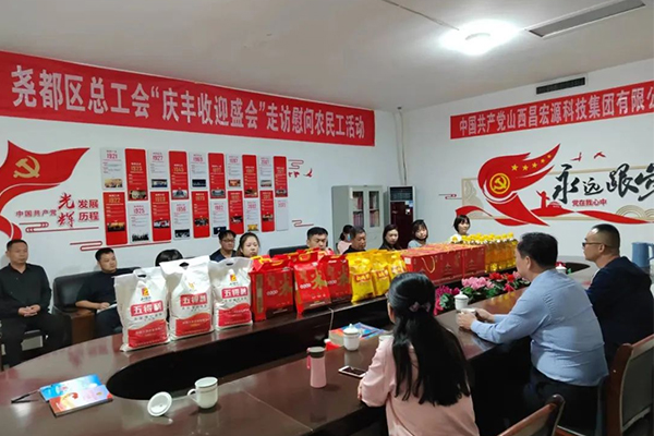2022年是黨的二十大召開之年,是進入全 面建設社會主義現(xiàn)代化國 家、向第二個百年奮斗目標進軍新征程的重要一年,也是鄉(xiāng)村振興全 面展開的關鍵之年。為慶祝第五個“中國農(nóng)民豐收節(jié)”,9月28日下午,臨汾市堯都區(qū)總工會開展以“慶豐收 迎盛會”為主題的慰問農(nóng)民工活動,區(qū)總工會主席秦奇杰等一行人來到我們山西昌宏源人力資源股份有限公司對13名農(nóng)民工進行走訪慰問,為我們送來米、面、油、小米、五谷雜糧等慰問品。