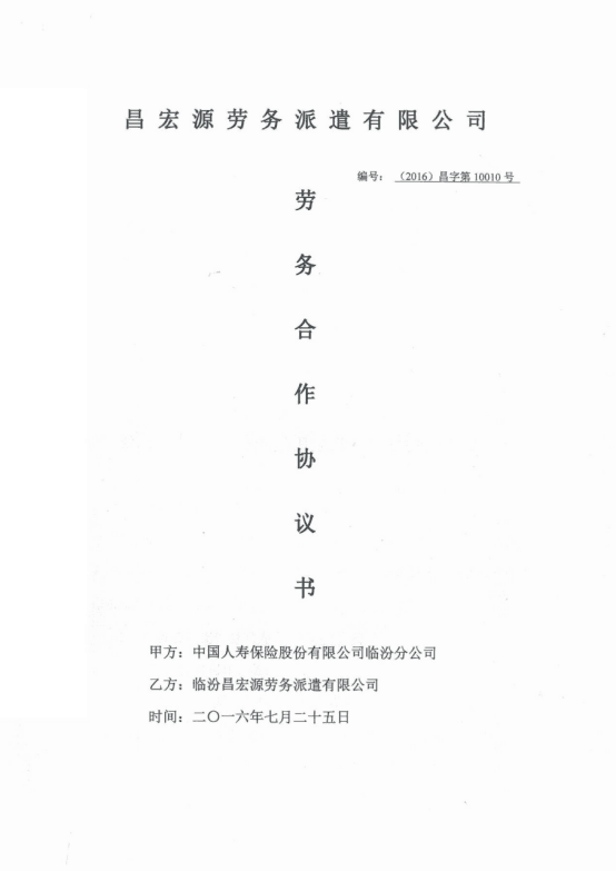 熱烈祝賀!臨汾昌宏源勞務(wù)派遣有限公司2016年7月25日在中國人壽保險股份有限公司臨汾分公司服務(wù)項(xiàng)目中成功合作。