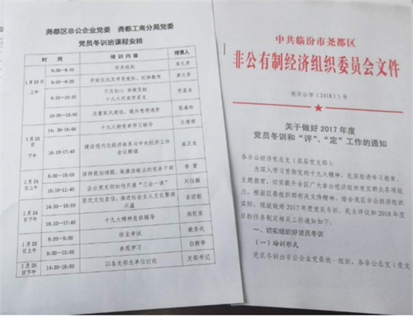 2018年1月23日,中共臨汾市堯都區(qū)非公有制經(jīng)濟組織委員會,開展關(guān)于做好2017年度黨員冬訓(xùn)和“評”、“定”工作學(xué)習(xí)會議,我公司積極參與了學(xué)習(xí),并在進(jìn)一步貫徹落實中。